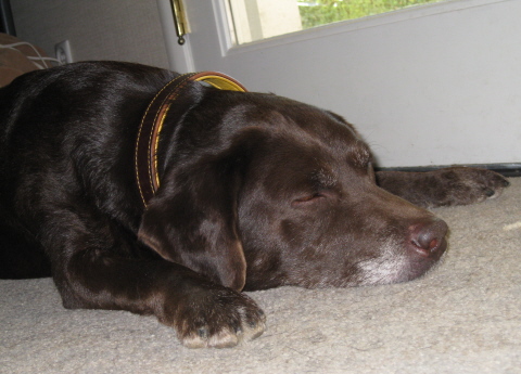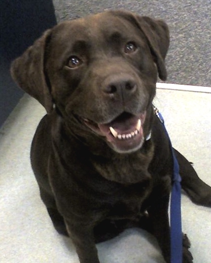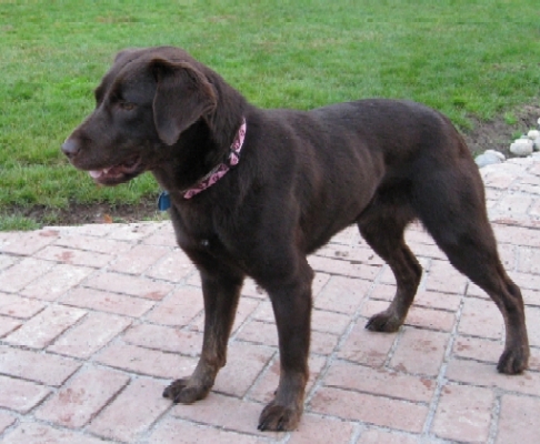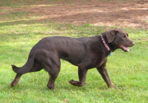 8/1/09-8/22/09: Lady is a very sweet and lovable spayed female chocolate Labrador who is about 6-7 years old. Don't let the early grey hair fool you -- she has plenty of youthful energy and attitude. She is a classic-looking English/British/show style of Lab who is a well-mannered and purebred little lady. She has typical Lab personality and looks with an otter tail and dewclaws removed. Lady is shorter and more compact than many Labs making her a nice sized pet who should reach an ideal weight of ~60 lbs with continued diet and exercise. She is 66 lbs currently and has lost 4 lbs in 3 weeks, so shouldn't have any problems getting to a healthier weight.