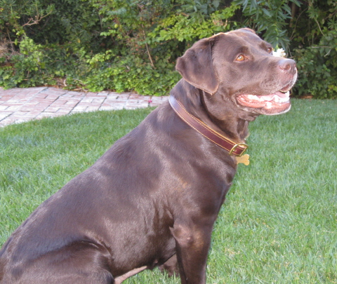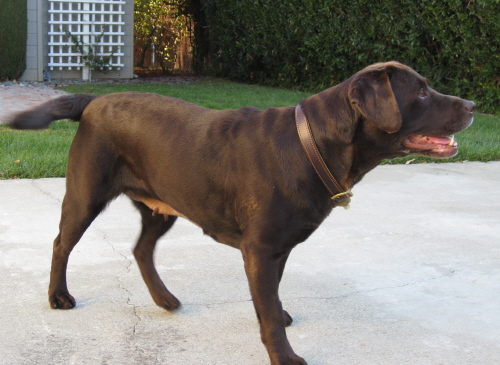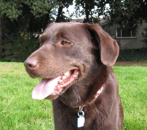 8/27/09 - 9/14/09: Molly Brown is a survivor just like the Unsinkable one! She's a female chocolate Labrador who is about 2-3 years old. Molly was spayed after her rescue from the shelter (scheduled for euthanasia the next day) and appears to have been used for breeding in the San Jose 'hood where she was picked up as a stray on 8/15. It's clear to see why someone wanted to breed her since she's an absolutely gorgeous purebred Lab (including otter tail and dewclaws removed) in the English/show style with a very sweet personality. Molly is currently 62 lbs and we're helping her lose a few pounds and get her figure back in shape now that she will no longer be having puppies.