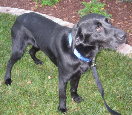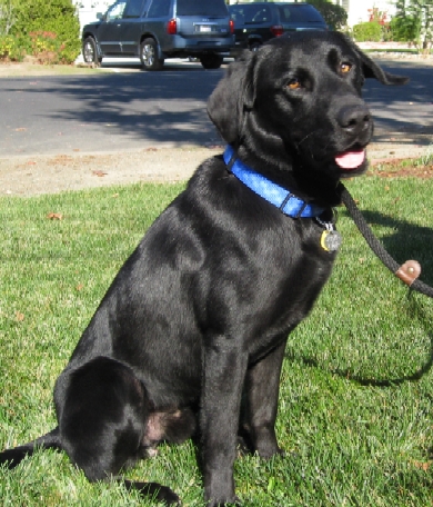 Molly is a dog who is easy to love. She is friendly with everyone she meets enthusiastically wagging her tail and bonding quickly with the rescue and vet workers and her foster parents. She follows us around the house and then lies down quietly at our feet to sleep. This Lab is smart and eager to please, for example she tried jumping on the people bed her first night and then didn't try again after we showed her she was supposed to lay down on the dog bed which she did and then slept quietly through the night (with one potty break). Miss Molly loves belly rubs and returns the favor with lots of kisses. Molly rides well in the car, is housebroken (whines to go out), and doesn't jump on people. She enjoys chewing on bones and other dog toys but doesn't chew on people things. Molly is great with other dogs, though was quick to chase squirrels/birds/cats on our first walks so may take some adjustment to a home with cats. Since she's been recovering from surgery, we haven't been able to let her run and fetch, but she was anxious to play with balls when the rescuers took her out of the shelter before surgery. She also has been splashing in whatever water she finds so we're guessing that she'll be a good swimmer like most Labs. Molly has some basic training and knows "sit", loves to give a paw with a shake/high5, and is pretty good on leash. She's a good eater with no food aggression (can take food away) and takes treats very gently from your hand.