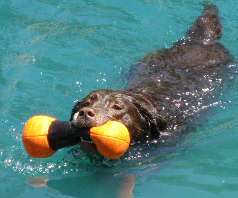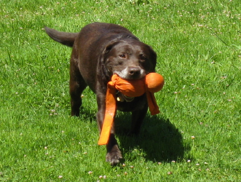 Lady loves to play with toys! She'll bring a smile to your face as you watch her exuberantly bound after a fetch toy and then happily bring it back to you again and again. Lady is a great swimmer and will water-retrieve all day long -- she even joined in a dock-diving event with our other Labs on 8/15-16. She often is found with a doggie chew toy in her mouth -- though never has tried to chew on people items. Lady will make a wonderful companion for either a couple or family. She is a very friendly dog who quickly bonds with people and adapts to new routines including her foster home and all the places we've taken her. At home, Lady follows us around happily wagging her tail and then lies peacefully at our feet wherever we are. We had no trouble letting her off-leash since she stayed by our side or came quickly when we called her. Lady is very good with dogs and children she has met. She plays, eats, cuddles with our Labs, and nicely greeted many other dogs in the park and dock diving event. She is very willing to please and has delightful manners. Lady is housebroken, good in car/travel, doesn't jump on people, can touch/handle her easily including for vet work or baths, sleeps all night, and is quiet (other than expected barks for passers-by). She appears to have some training and quickly learned "sit" and "drop" and is OK on leash.