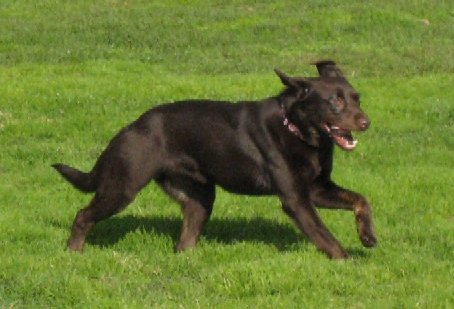 8/27/09 - 9/14/09: Molly Brown is a survivor just like the Unsinkable one! She's a female chocolate Labrador who is about 2-3 years old. Molly was spayed after her rescue from the shelter (scheduled for euthanasia the next day) and appears to have been used for breeding in the San Jose 'hood where she was picked up as a stray on 8/15. It's clear to see why someone wanted to breed her since she's an absolutely gorgeous purebred Lab (including otter tail and dewclaws removed) in the English/show style with a very sweet personality. Molly is currently 62 lbs and we're helping her lose a few pounds and get her figure back in shape now that she will no longer be having puppies.